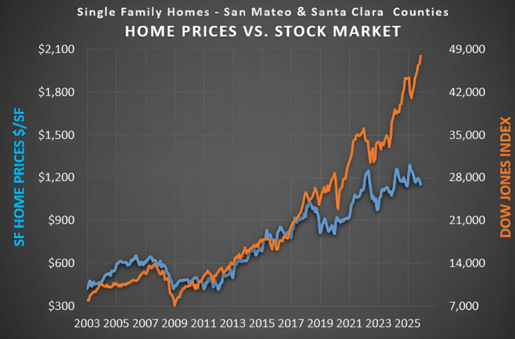 Meanwhile, the relationship between home prices and stock indexes has diverged. Since the start of 2024, the Dow Jones Industrial Average is up approximately 26%, while single- family home prices increased only about 4% over the same period.