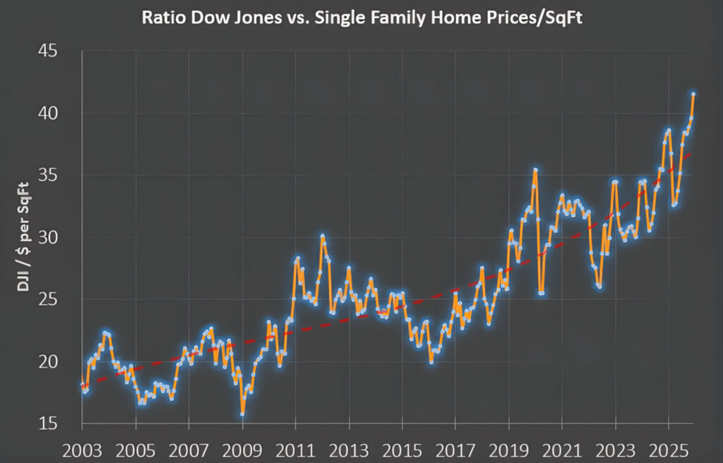 In 2003, the Dow Jones Index was roughly 18 times the average price per square foot of a single-family home. Today, that ratio is closer to 43 times, highlighting how stock indexes have appreciated far faster than home prices over time.
