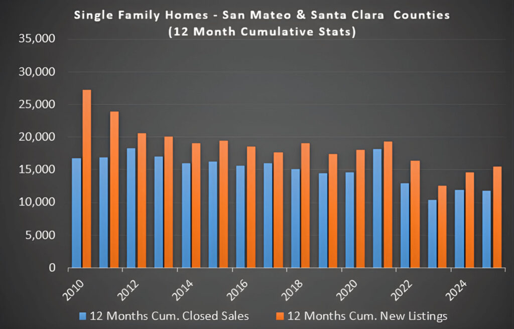 2025 was essentially a flat year for single-family home (SFH) prices in Santa Clara and San Mateo Counties. As expected, prices experienced a seasonal bump in the spring, but the year both began and ended at approximately $1,150 per square foot of living space. The average single-family home sold for $2,420,000, nearly identical to 2024.